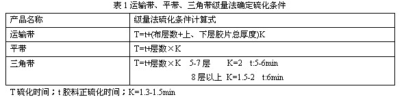 用_量法制定運輸帶、平帶、三角帶等產品方面早有成熟的經驗式(表1)。在50年代我們常用每毫米1.5-2.5分估算外胎的正硫化時間,由于技術條件不同(配方、骨架材料、硫化外壓溫度、過熱水溫度、水胎厚度、硫化方式)再加上人的經驗上的差異,估算外胎的正硫化時間誤差較大。