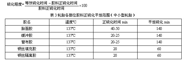 5、胎面硫化程度應控制160%,輪胎生產質量才能穩定,硫化平坦范圍如(表3)。
