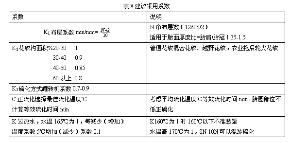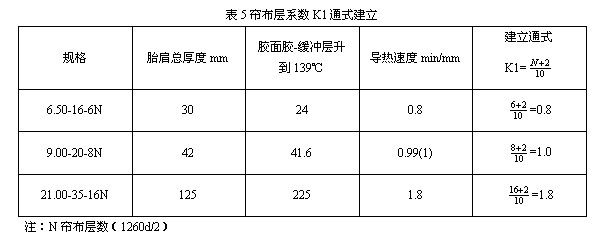 T:外壓正硫化時間min;B:胎肩厚度;K1:簾布層數系數(min/mm);K2:胎面花紋溝面積修正系數;K3:硫化罐機修正系數;C:胎面膠正硫化等效時間(min);K:內壓過熱水溫度修正系數