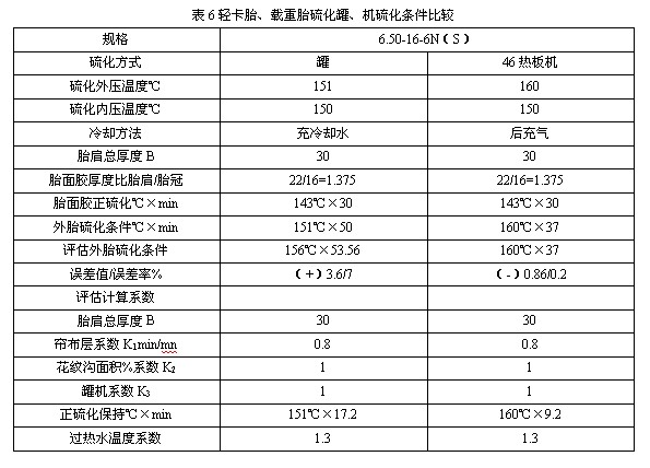 用級量法評估計算外胎硫化條件。輕卡胎、載重胎(表6),工程胎、農業胎(表7)外胎硫化條件誤差率多數5%以下,證明方法基本可行。建議采用系數(表8)。