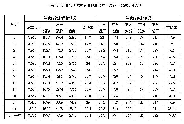 按照2012年新胎購置成本,40.2萬元可購243條輪胎。報(bào)表以充分說明上海公交對(duì)節(jié)約輪胎資源,所采取的措施、方法是相當(dāng)有成效的,有效履行企業(yè)對(duì)節(jié)約資源、_創(chuàng)建低碳社會(huì)的責(zé)任。
